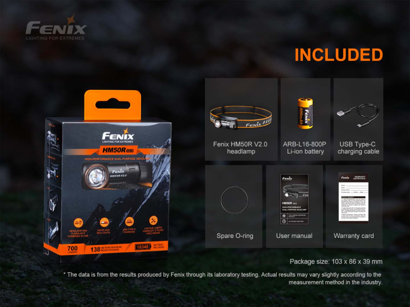 - Součástí balení je čelovka, popruh na hlavu, spona, náhradní o-kroužek, akumulátor Fenix ARB-L16-800P 800 mAh a nabíjecí USB-C kabel.