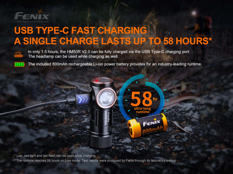 Fenix HM50R V2.0 je druhá generace oblíbené nabíjecí čelovky s výkonem až 700 lumenů, dosvitem 138 metrů a červeným světlem. K napájení lze použít buď Li-ion akumulátor RCR123A (je součástí balení), nebo jednorázovou baterii CR123A (s omezeným max. výkonem na 130 lumenů). Akumulátor RCR123A lze dobíjet přes USB-C konektor přímo v čelovce. Světelným zdrojem je špičková LED Luminus SST-20 s denním odstínem světla (5700 K). V ovládacím tlačítku na boku čelovky je též zabudována indikační dioda, která po stisknutí ukazuje stav nabití baterie.