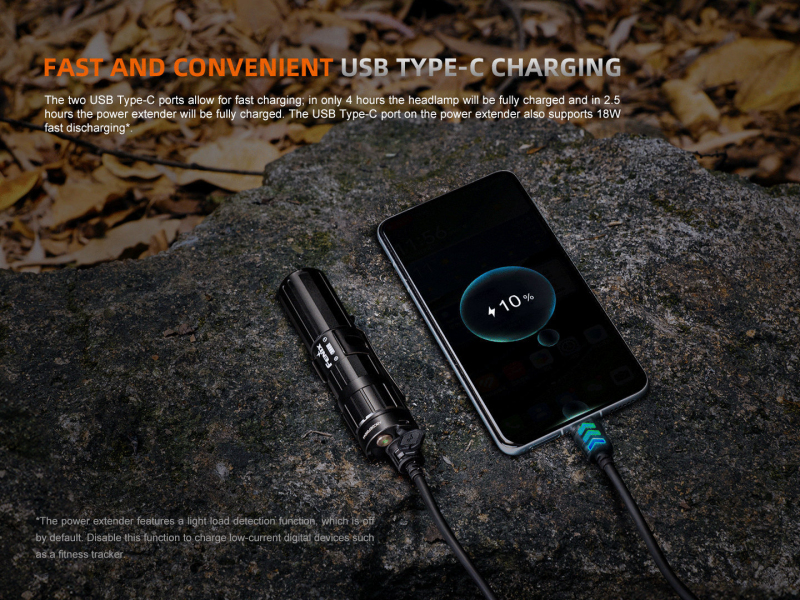 Funkce detekce nízkého zatížení powerbanky – Když je funkce powerbanky na zadním bateriovém pouzdře zapnutá, tak 3 vteřiny podržte tlačítko na pouzdře. Zapnutí funkce detekce nízkého zatížení je indikováno třemi červenými bliknutími indikační LED v tlačítku. Vypnutí funkce indikuje osm červených bliknutí. Tato funkce je určená pro nabíjení USB zařízení s velmi nízkým odběrem, jakou jsou například fitness trackery a bezdrátová sluchátka. Se zapnutou funkcí detekce nízkého zatížení se powerbanka automaticky přestane vybíjet, když je čelovka plně nabitá. Pro restartování funkce powerbanky do ní znovu zapojte USB-C kabel, nebo stiskněte tlačítko na bateriovém pouzdře. Při vypnuté funkci detekce nízkého zatížení vypněte funkci powerbanky tlačítkem, když je čelovka plně nabitá, abyste předešli zbytečnému vybíjení baterie v zadním bateriovém pouzdře.