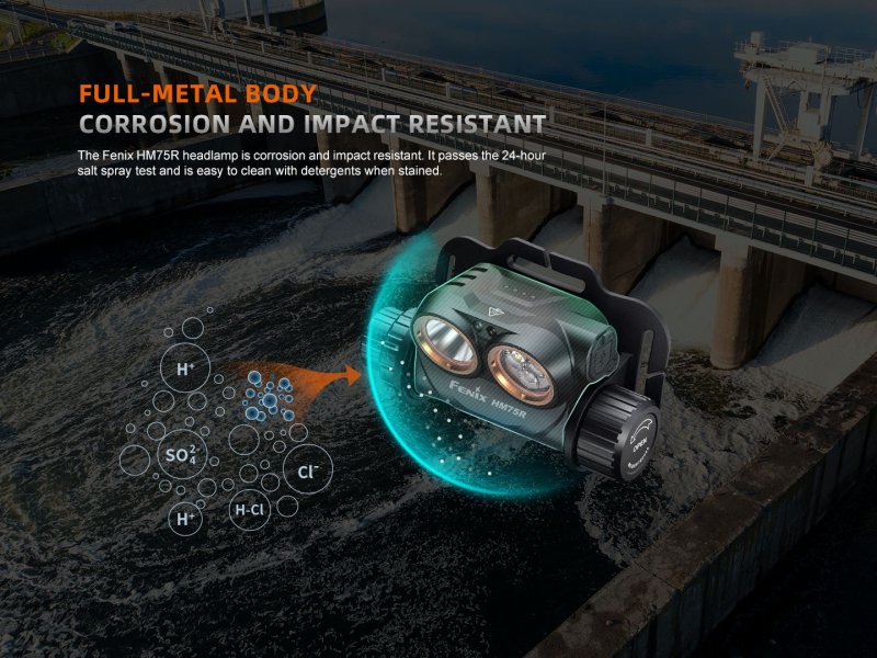 Nabíjecí čelovka Fenix HM75R disponuje dvěma světelnými kužely s výkonem až 1600 lumenů a silným červeným světlem s výkonem až 120 lumenů. Přičemž dálkový reflektor se špičkovou LED Luminus SST-40 vytváří dobře zaostřený světelný paprsek s dosvitem až 223 metrů a druhý reflektor s výkonnými LED Luminus SST-20 má světelnou stopu velmi širokou a plynulou s dosvitem do vzdálenosti 60 metrů. Světelný tok dálkového reflektoru je až 1600 lumenů, reflektor s širokým kuželem nabízí maximální výkon 1000 lumenů a neutrální odstín světla. Světlo z obou reflektorů nelze kombinovat, snadno se mezi nimi přepíná otočným voličem na boku čelovky.
